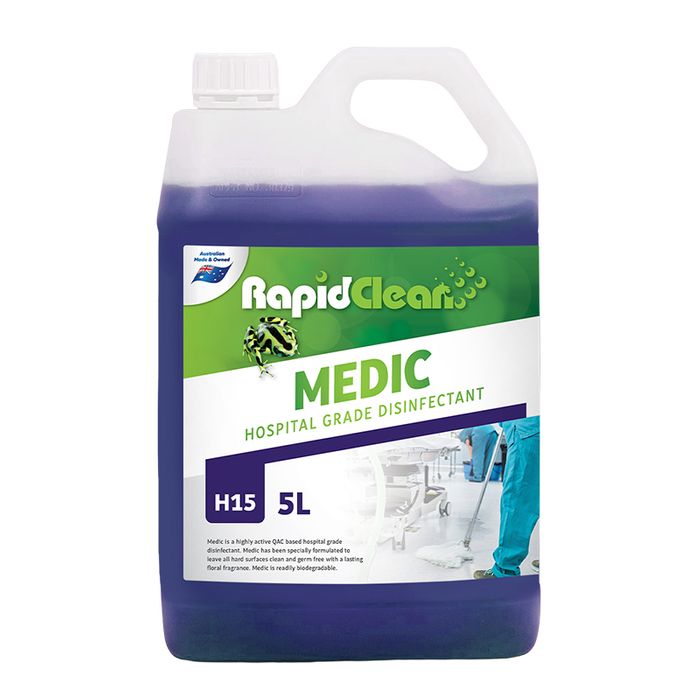 RapidClean Medic Hospital Grade Disinfectant is a clear blue coloured liquid that contains a combination of cleaning agents and highly effective quaternary sanitisers plus a long lasting floral fragrance. Medic will reduce the number of pathogenic organisms to such a level that they are no longer able to initiate an infection. Medic meets the NSW Health Department Standards proposed in the Therapeutic Goods Act.